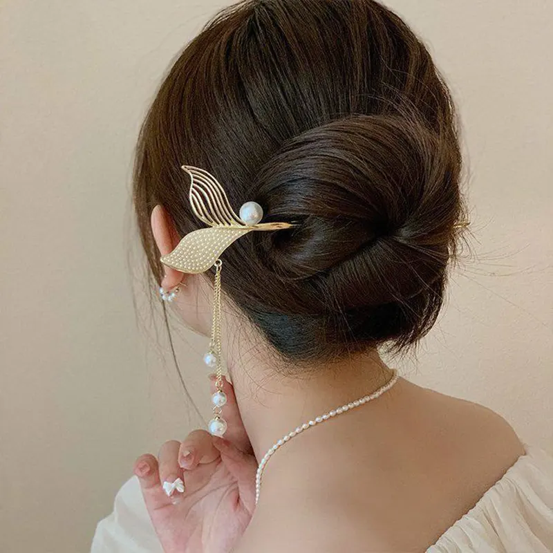 کشف زیبایی با کانزاشی طرح دم پری دریایی! گیره موی طلایی لوکس و نفیس با مرواریدهای درخشان و زنجیرهای ظریف، انتخابی ایدهآل برای تکمیل استایل موی مجلسی، سنتی ژاپنی یا روزمره. کیفیت ساخت بالا و طراحی منحصربهفرد، این اکسسوری را خاص میکند.